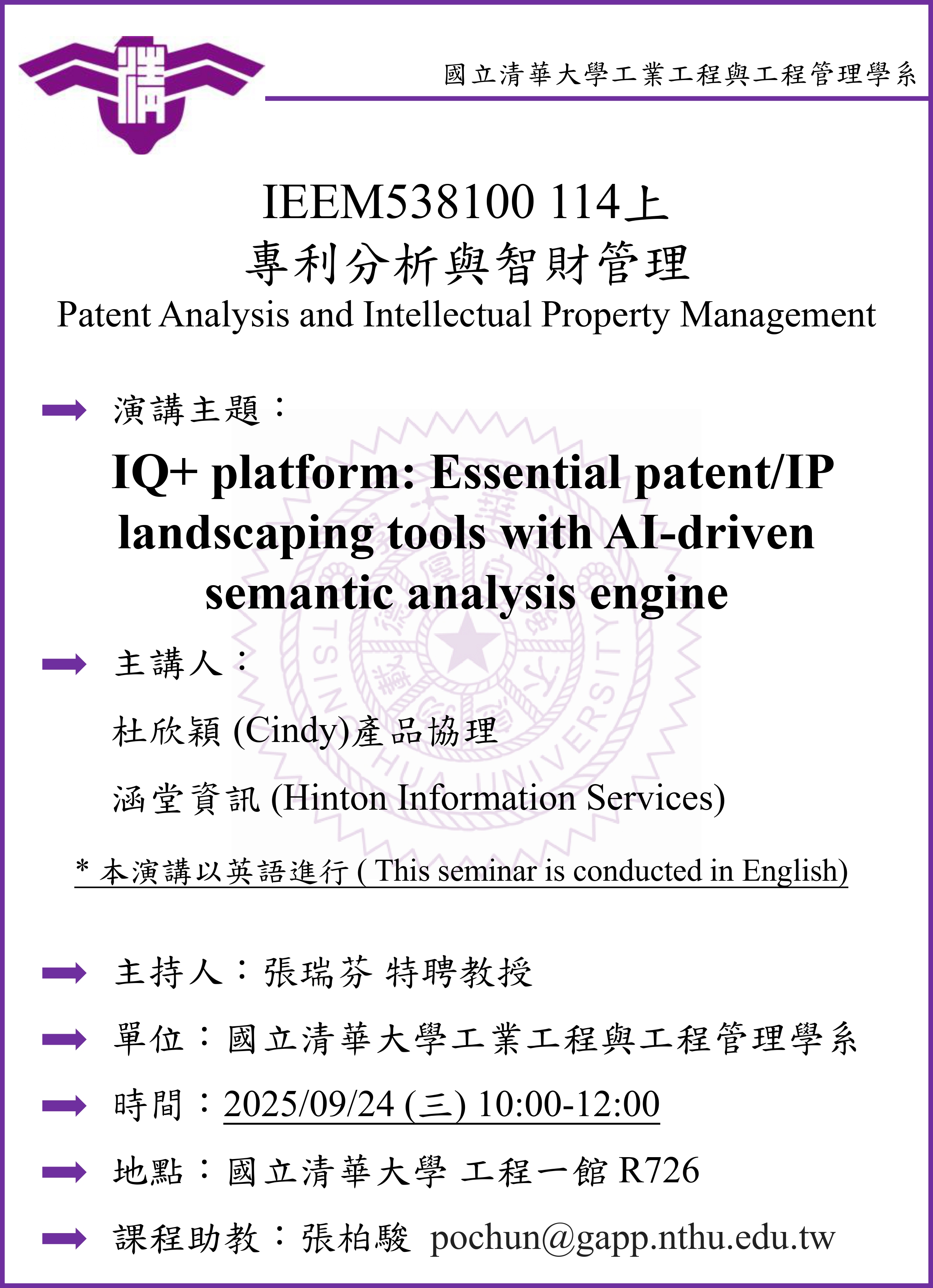IQ+ platform: Essential patent/IP landscaping tools with AI-driven semantic analysis engine 演講者:杜欣穎 產品協理 (涵堂資訊)