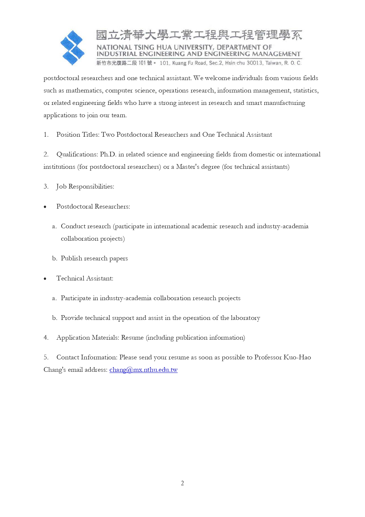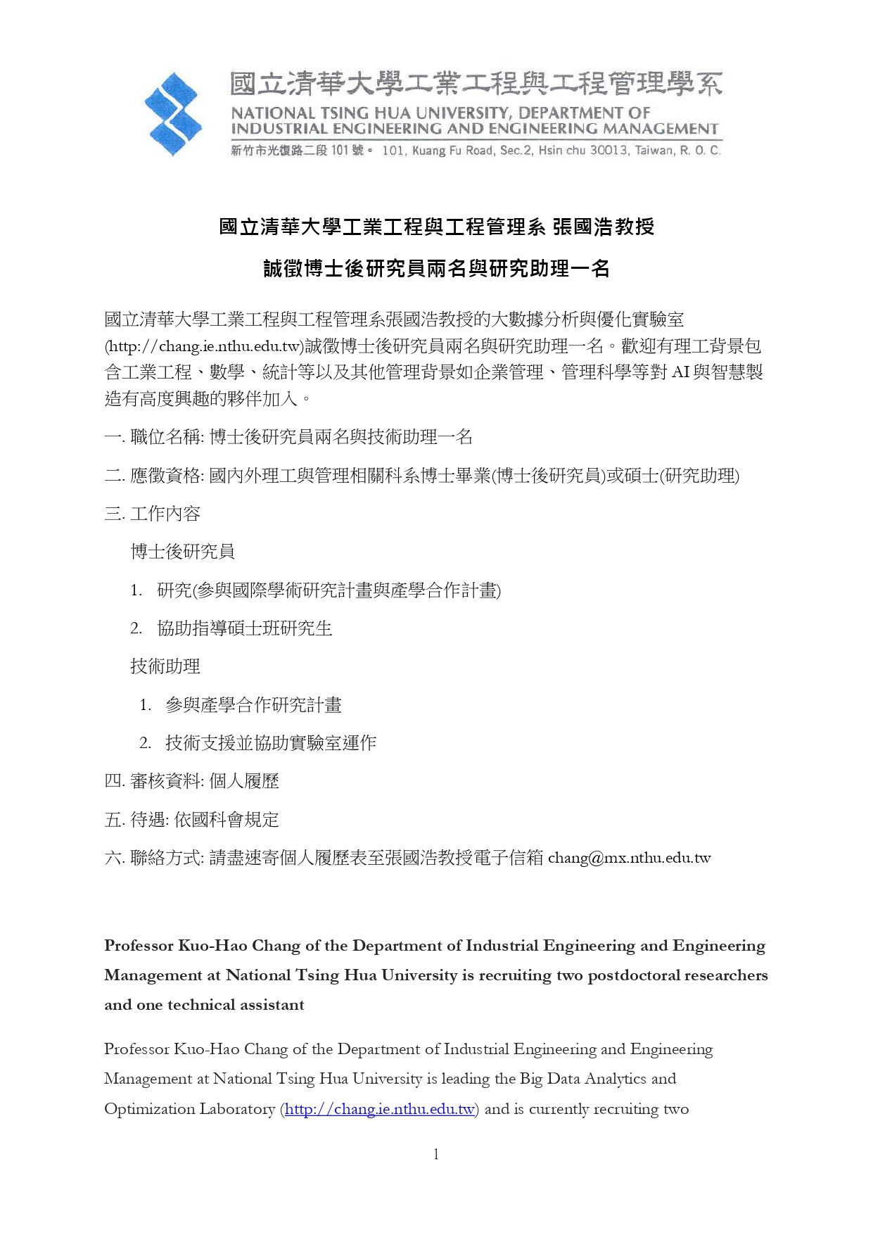 國立清華大學工業工程與工程管理系 張國浩教授 誠徵博士後研究員兩名與研究助理一名