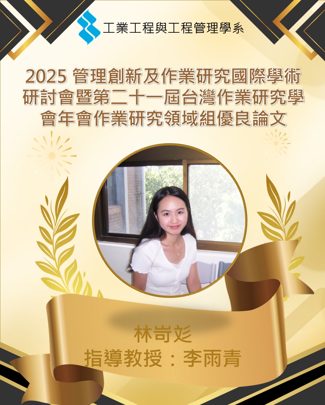 恭喜本系學生林岢彣(指導教授:李雨青)榮獲 2025 管理創新及作業研究國際學術研討會暨第二十一屆台灣作業研究學會年會作業研究領域組優良論文獎