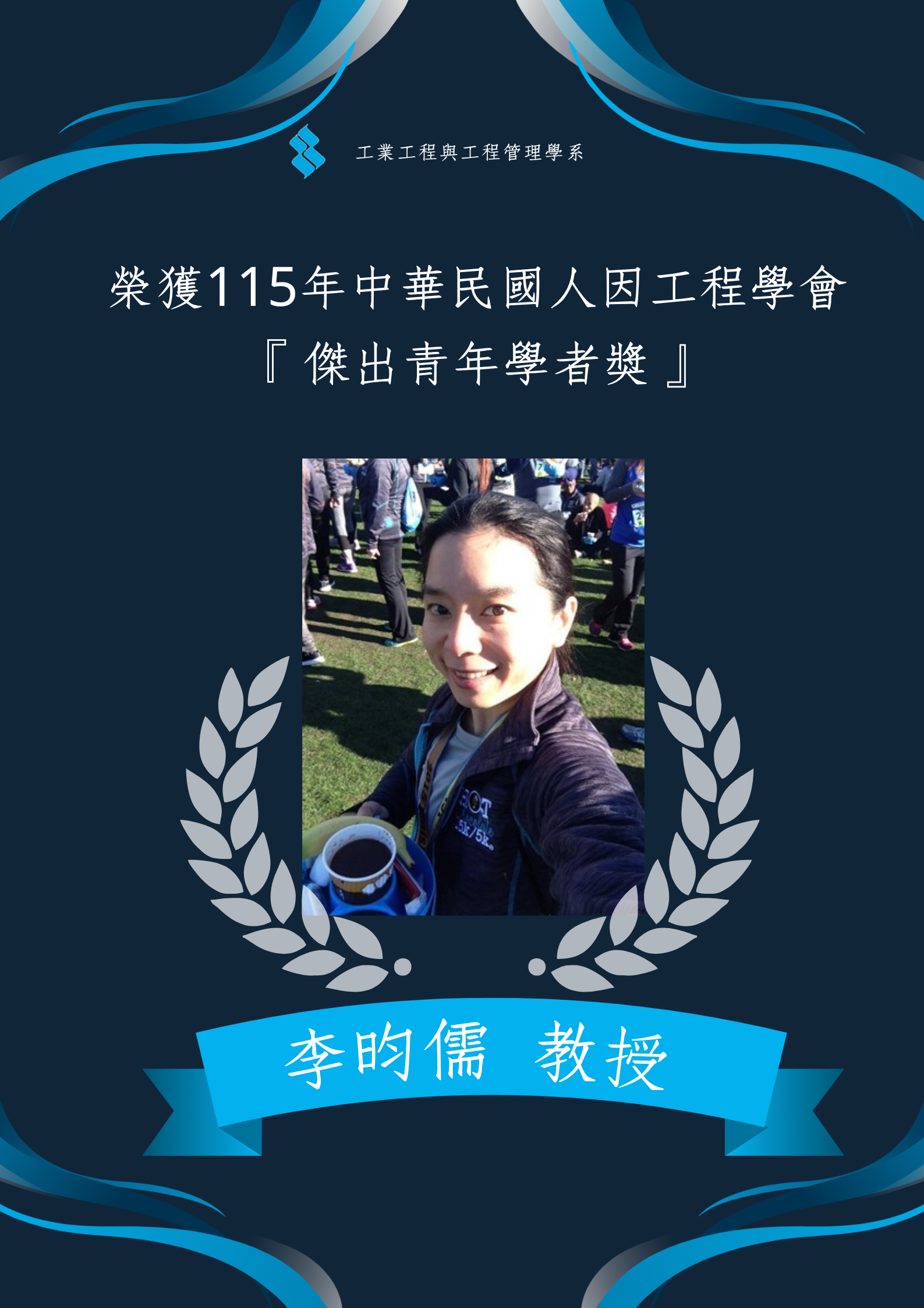 恭喜本系李昀儒教授榮獲115年中華民國人因工程學會『傑出青年學者獎』